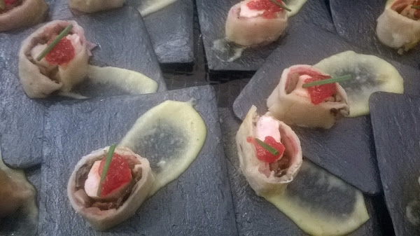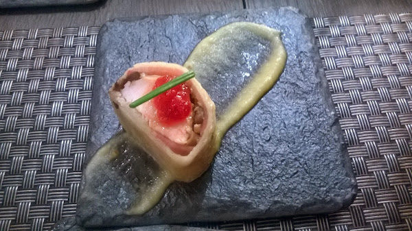 Consistía en un hojaldre que envolvía en forma de rulo una pechuga de pollo fileteada envuelta de setas y bacon con un puré de manzanas y ajo asados y una mermelada de pimientos del piquillo.