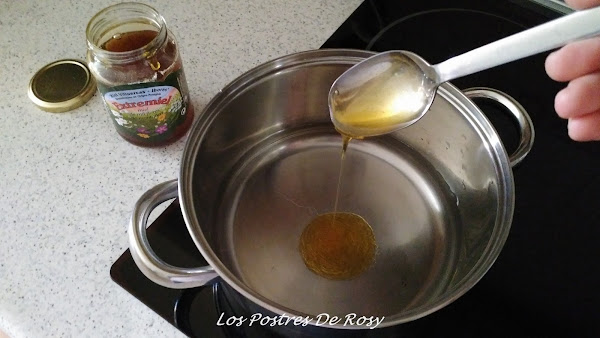 - En un cazo ponemos 500 ml. de agua y agregamos la miel. Cocinamos a máxima potencia hasta que rompa a hervir.