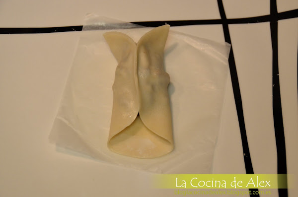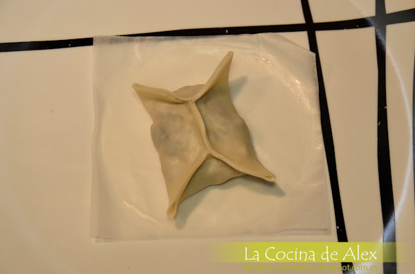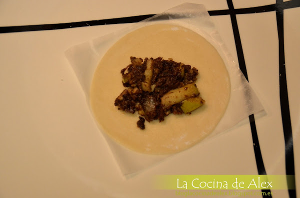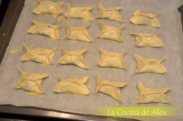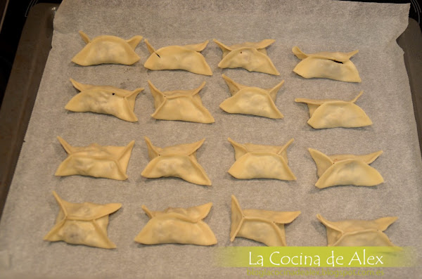 Precalentamos el horno a 200º. Para el montaje de las "empanadillas" ponemos un poco de relleno en el centro de la oblea, mojamos todo el borde con un poco de agua y montamos las "empanadillas" de la forma clásica o dándole rienda suelta a la imaginación, yo os muestro una de las opciones que tenéis.