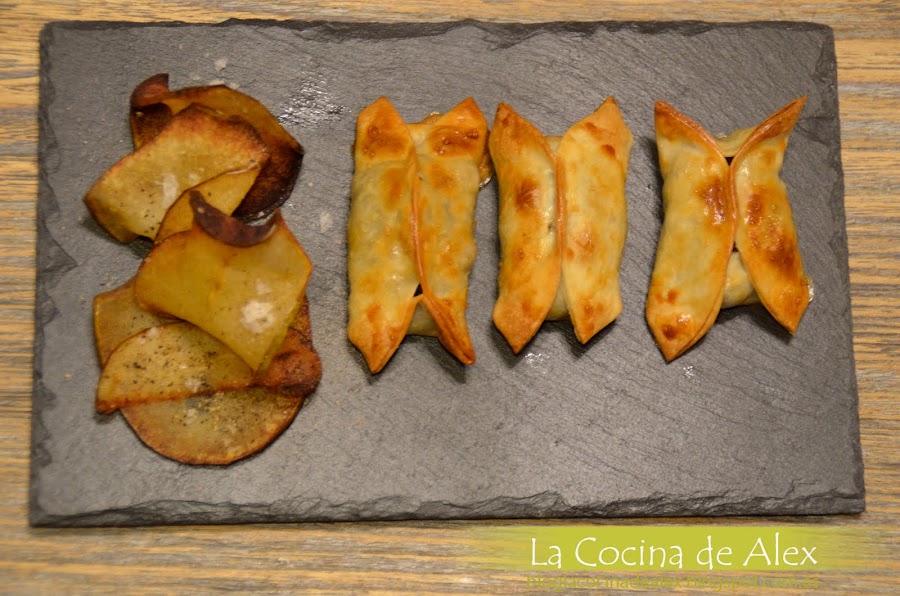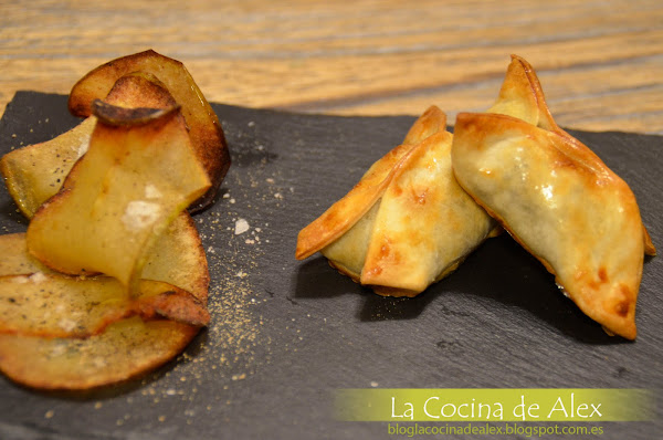 Para la presentación final simplemente acompañamos las empanadillas con los chips de manzanas previamente sal-pimentadas y a disfrutar de un aperitivo que os va a sorprender.