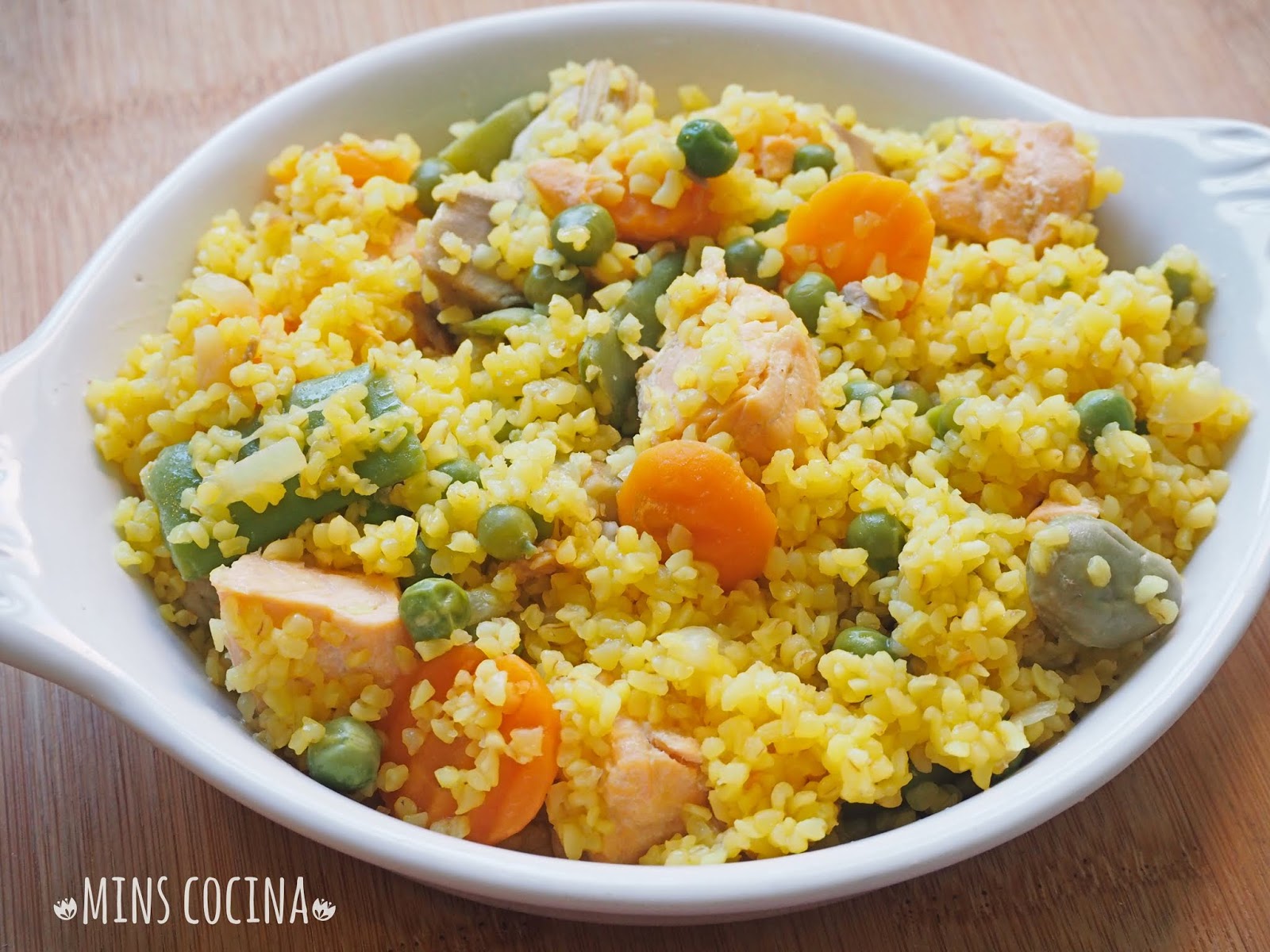 Hoy toca receta de esas que dan mucho juego. Que no tenéis alguno de los ingredientes, lo cambiáis por otro. Nuevo plato, igual de rico. Y es que los cereales, son así, versátiles como pocos. Yo hoy cambio el arroz (ya, ya sé que aún con arroz esto no sería oficialmente una paella pero... pelillos a la mar!) por bulgur para darle un toque exótico a esta "paella" deliciosa de verduras y salmón, que se hace en un momento y queda de lujo. Os animáis a probarla? :)