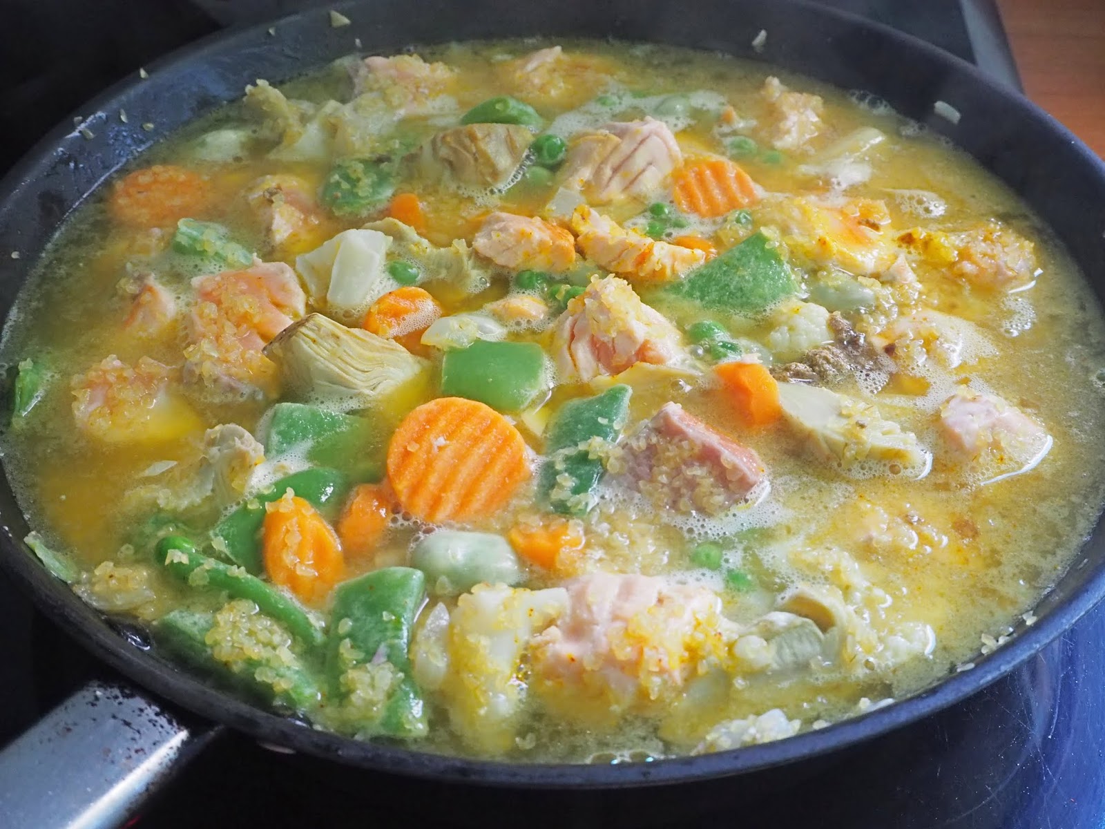 - Cuando las verduras estén descongeladas y más bien tiernas, añadimos los trozos de salmón. Salamos al gusto y removemos.