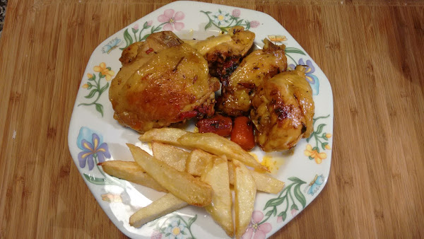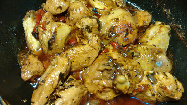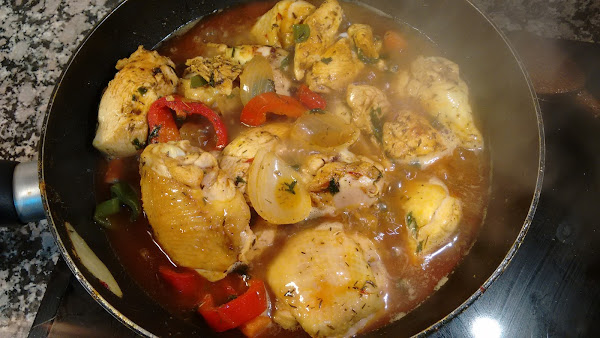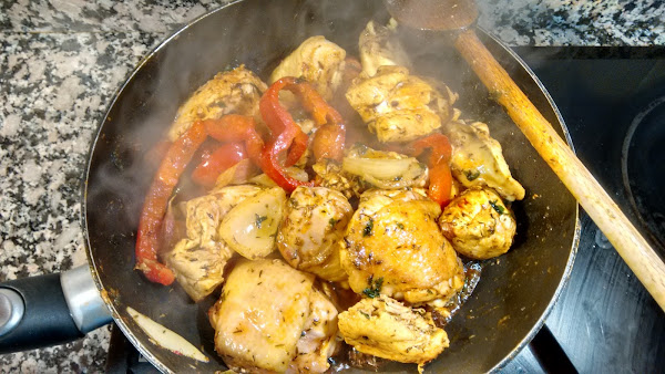 Calentar en la sartén el aceite a fuego fuerte y reogar el pollo junto con el resto de ingrediente, cuando esté doradito se le incorpora el vino, el agua y se deja chup, chup a fuego medio hasta reducir.