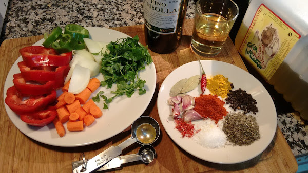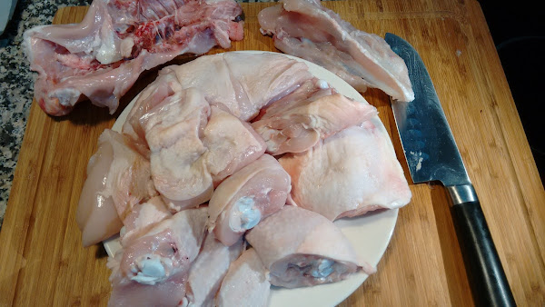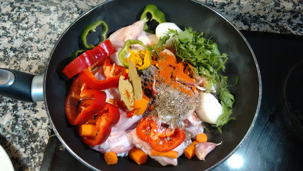 Se corta el pollo y la verdura en trozos gruesos, los ajos con la piel un poco machacaos con la hoja del cuchillo.