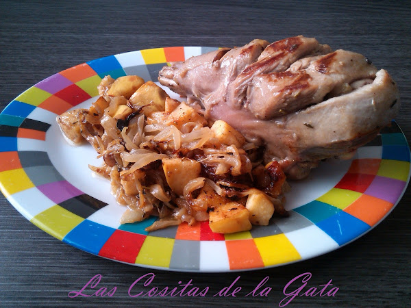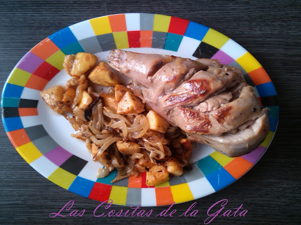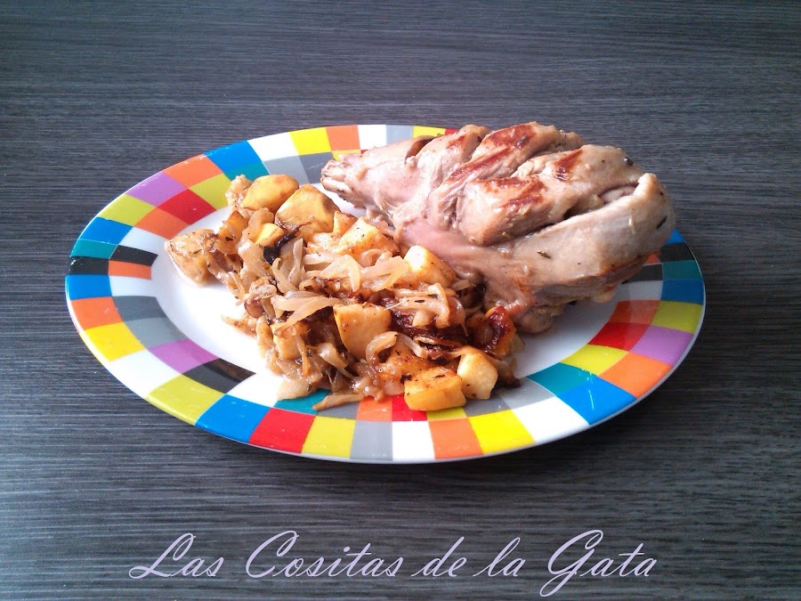 Antes de nada he de decir por qué utilizo las comillas cuando digo pollo, y es que yo creía que era pollo, pero sigo sin estar segura de qué carne he utilizado. En crudo tenía pinta de serlo (además de que siempre que compramos ave, compramos pollo), aunque un poco grande. Luego el sabor no era de pollo, tampoco la textura. Debido a lo grande que era decidí llamarlo pata de avestruz. Aún así, sigue siendo un secreto qué tipo de ave era.