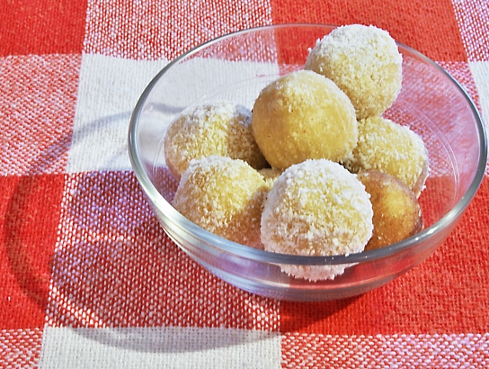 Damos forma a las bolitas, más o menos como si estuviéramos haciendo albóndigas, y las "rebozamos" en coco rallado, o en azúcar glas, o unas cuantas en cada, como se prefiera.