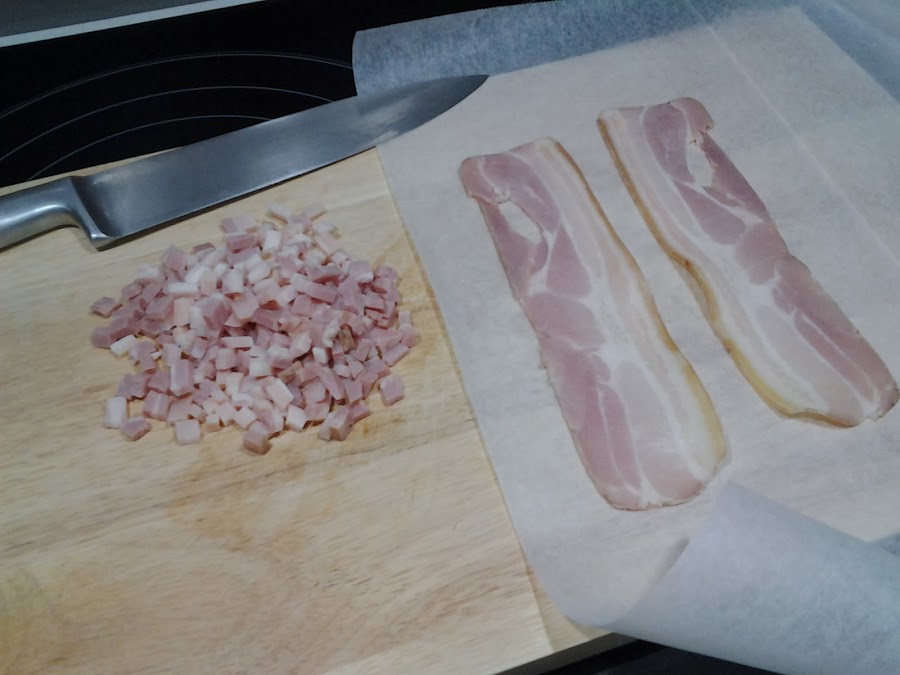 Cortamos en brunoise las dos tiras gruesas de bacon. Las otras dos restantes las ponemos entre dos papeles sulfurizados y las metemos en el horno a 200º durante 10 minutos para que se queden sequitas y crujientes.