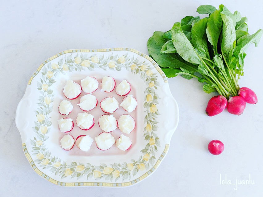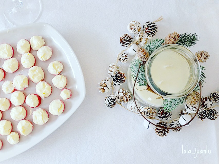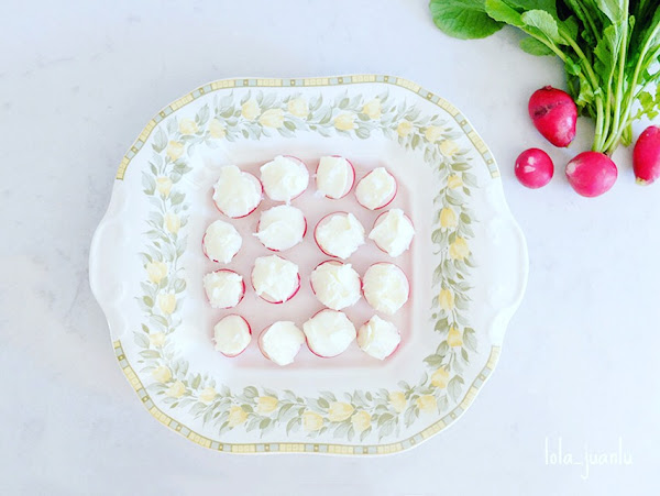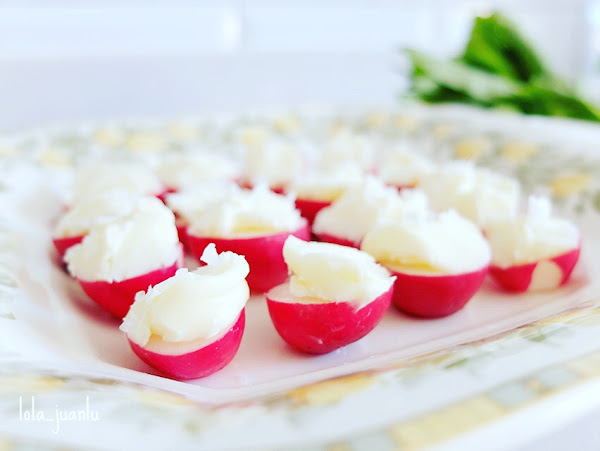 Lavamos y secamos bien los rabanitos. Cortamos los extremos y por la mitad. Al cortar los extremos las mitades se apoyan mejor al colocarlas sobre una bandeja.