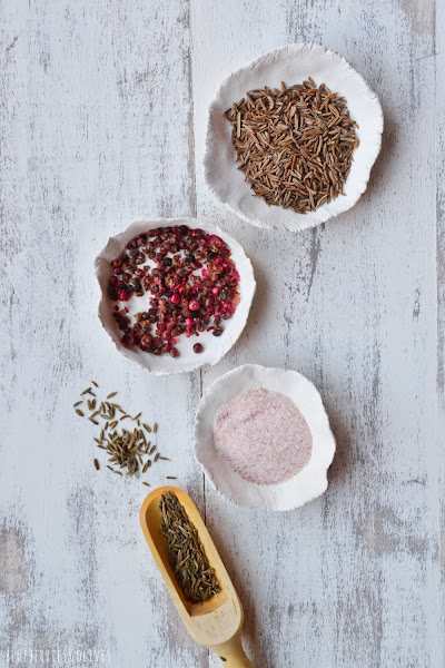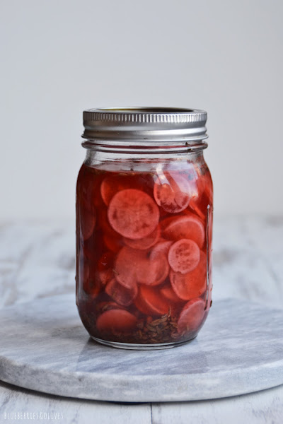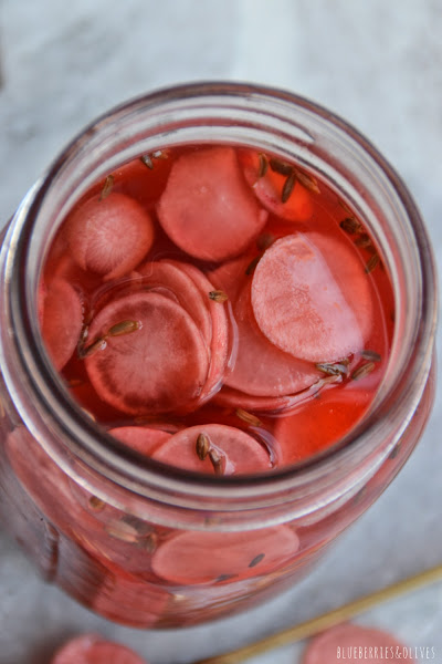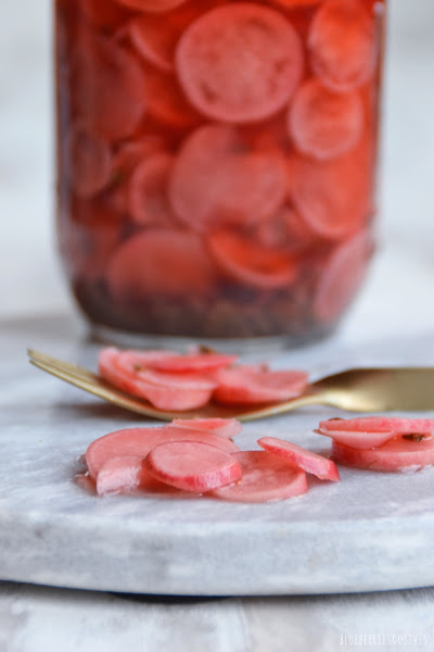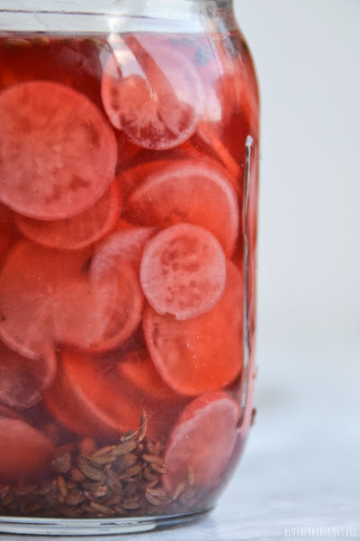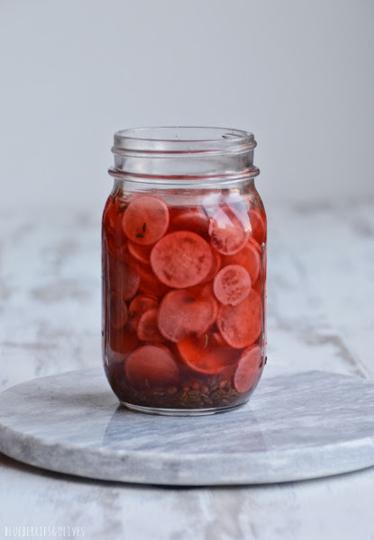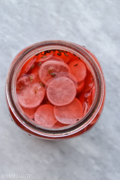 Es una receta de marinado exprés, algo así como un encurtido rápido, lo preparamos y podemos consumirlo al momento o al cabo de unas horas cuando haya cogido saborcito del vinagre y las especias. Esta misma receta queda muy bien con otras verduras de raíz como zanahoria o remolacha pero también con pepinos, cebolla... También puedes variar las cantidades a tu gusto, añadir más vinagre, sal... y combinarlo con las especias o hierbas que más te guste. Yo he usado comino en grano, pimienta roja y alcaravea, ésta última sé que no es muy fácil de encontrar, pero es que desde que la descubrí me tiene fascinada. El grano es parecido al del comino, pero el sabor no tiene nada que ver, tiene como un toque mentolado y anisado muy peculiar que queda genial en salsas, vinagretas, mayonesas...