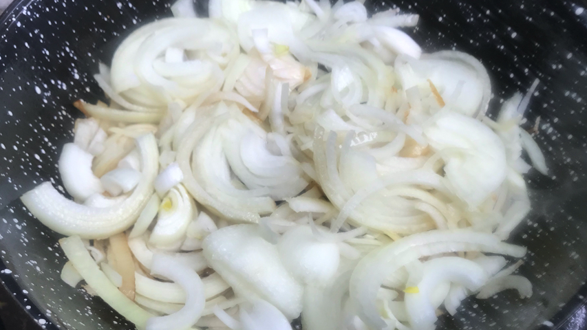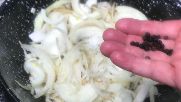 Incorpora la cebolla, sazona, añade los granos de pimienta y deja que sofría durante unos 7-8 minutos (hasta que esté dorada) moviéndola de vez en cuando.