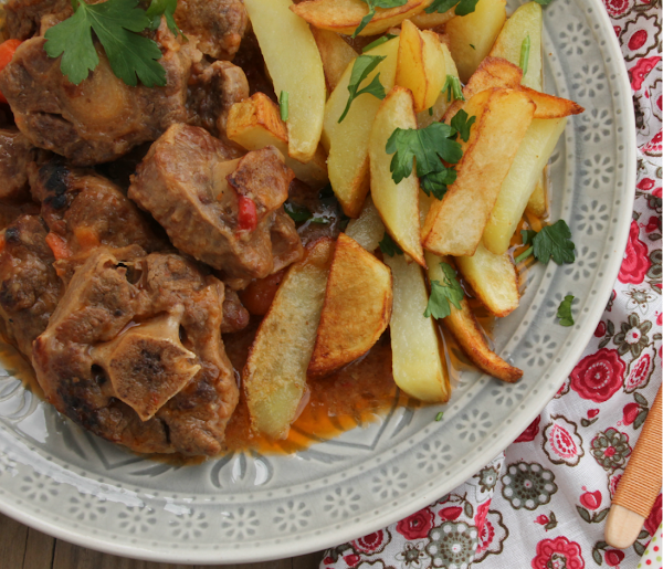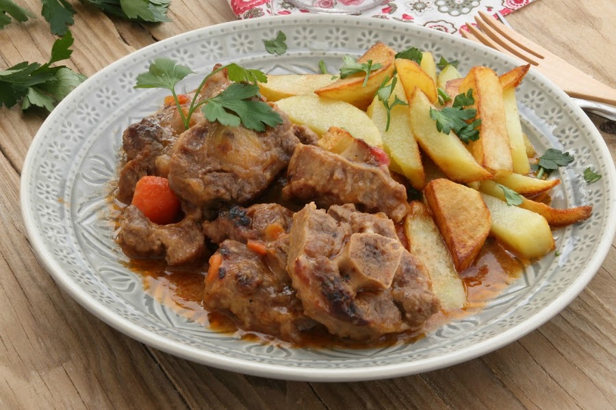 .Tapamos la olla, dejamos hervir a fuego medio una hora hora y media, hasta que la carne esté tierna. .Servimos en un plato con su salsa junto a unas patatas fritas de guarnición.