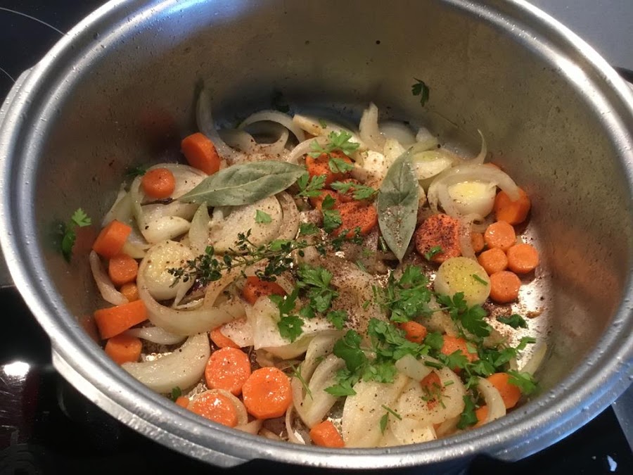 En el mismo aceite, ponemos la cebolla picada, la zanahoria en rodajas, los ajos enteros y el perejil picado, sofreímos durante unos minutos.