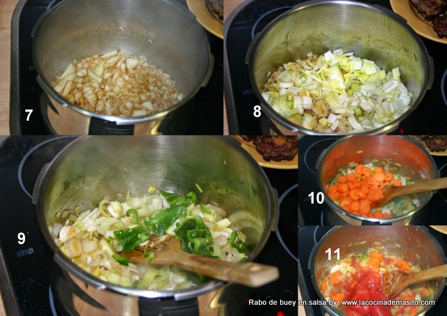 10 y 11- Una vez este bien pochado añadiremos la zanahoria y los tomates y lo dejaremos pochar unos cuantos minutos