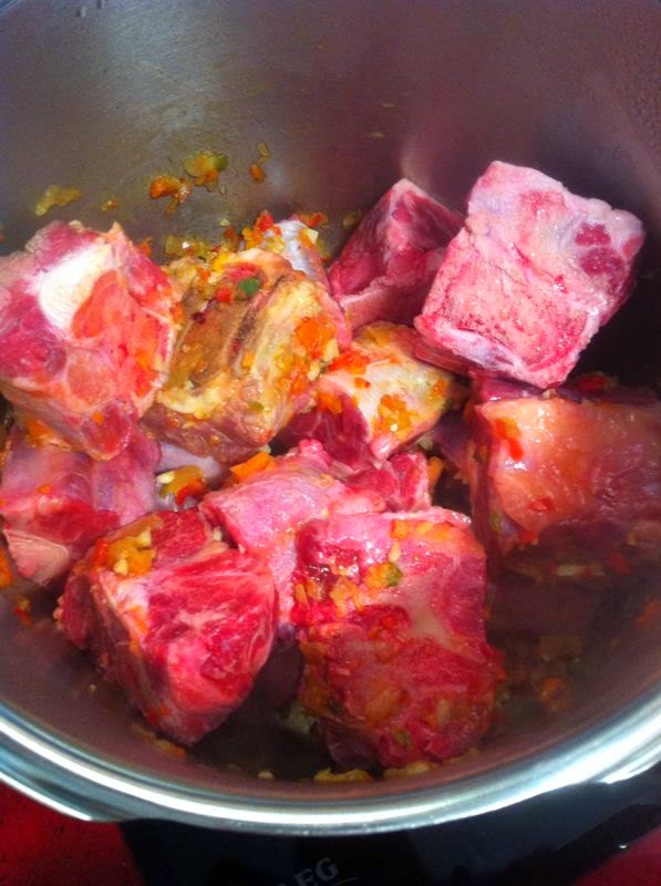 Cuando la tengamos ligeramente pochada, añadiremos el rabo y salpimentaremos.