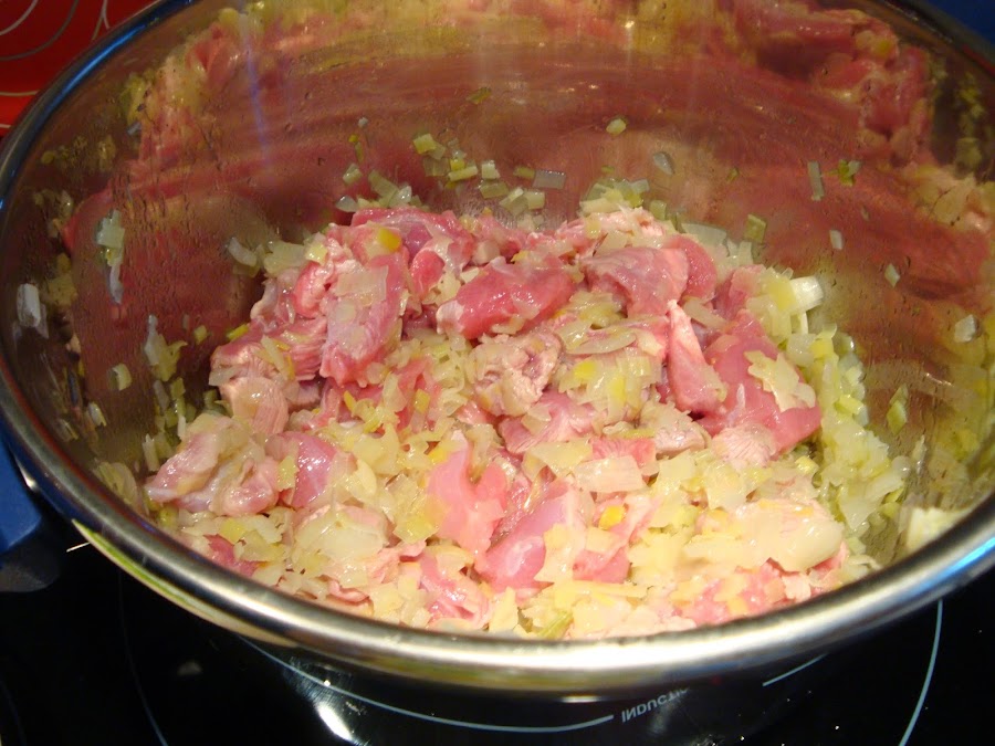 Una vez que tenemos esto rehogado añadimos la carne de pavo para que se vaya dorando por ambos lados.