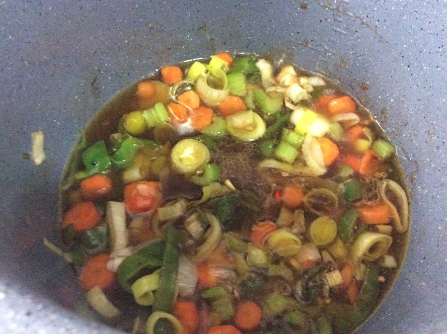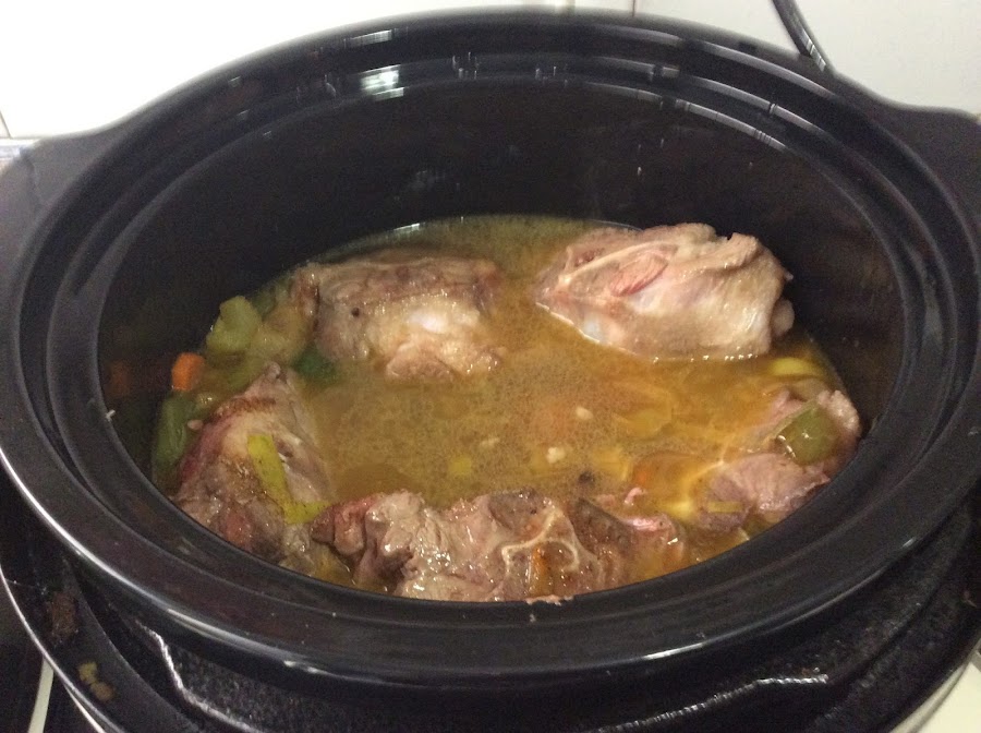 Pasamos tanto las verduras sofritas como la carne a la cubeta slowpot. Cubrimos con caldo de carne o agua y dos cucharadas de bovril.