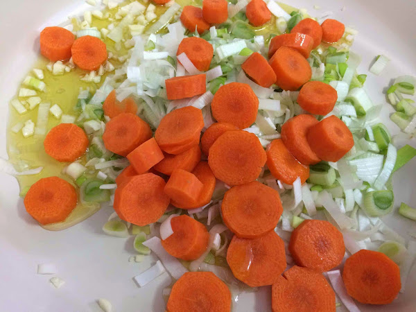 Comenzamos rehogando los dientes de ajo picados junto con la cebolleta y las zanahorias.