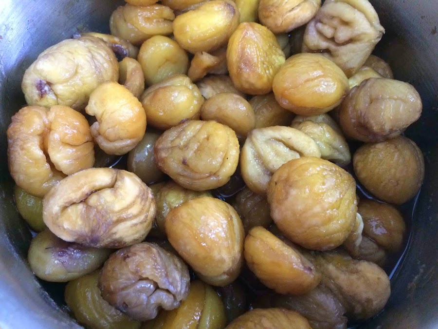 En un cazo cocemos las castañas con el vaso de vino dulce de Málaga y dos cucharadas de miel de caña. Es importante que estemos pendientes durante la cocción para que no se nos rompan y queden enteras.