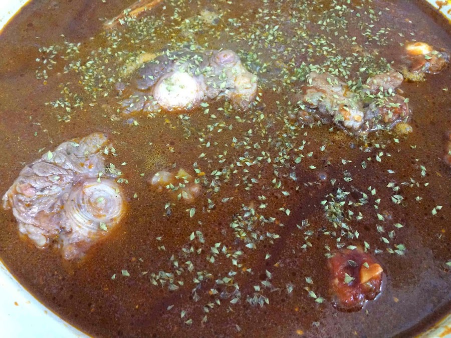 Cuando el rabo de toro tome un bonito color dorado es el momento de agregar el vino tinto. Añadimos la canela, el laurel, los clavos y el orégano. Cubrimos con el caldo de carne y dejamos hervir a fuego medio durante al menos 2 horas y media.