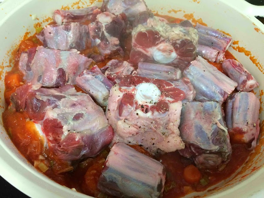 Agregamos el tomate pelado y rallado. Seguimos haciendo el sofrito hasta que el tomate esté bien hecho. En ese momento incorporamos el rabo de toro salpimentado.