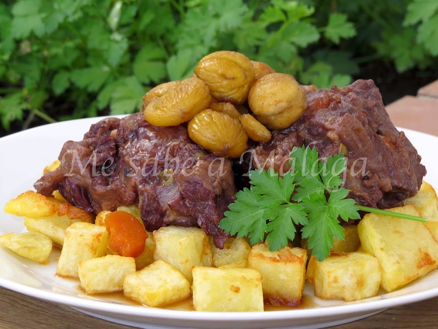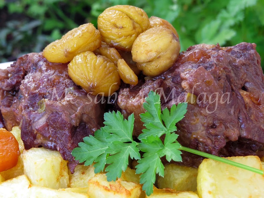 El rabo de toro con castañas es un plato típico de la Serranía de Ronda. El contraste de sabores es una exquisitez que os recomiendo probar. Eso sí, este plato es para un día de fiesta y hay que hacerlo con tranquilidad ya que necesita varias horas de cocción para que la carne esté bien hecha y se desprenda del hueso.