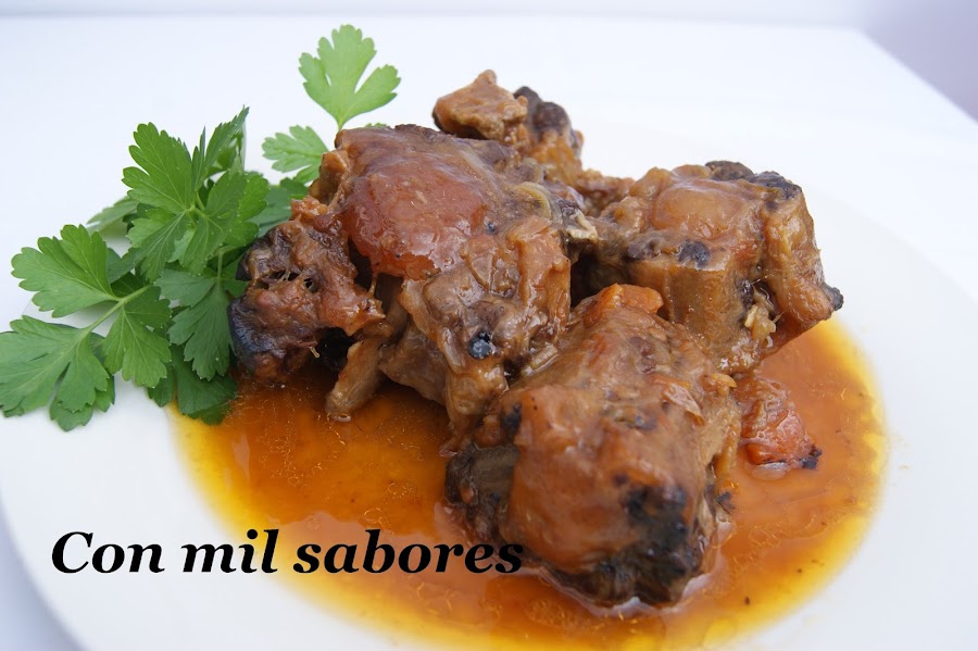 Pues ha sido un enorme dilema!!!...comérmelo?...no!!...ponerle el nombre..."rabo" ó "cola" es que ninguno de los dos me sonaba muy bien. Y yo que culpa tengo, si es que es lo que es!!!. Si lo llamaba "rabo" me imaginaba al toro en el campo espantando las moscas con él, golpeándolo de un lado a otro de su trasero y si lo llamaba "cola" me imaginaba otras cosas que para que contaros, mejor vosotros mismos. Pero después pensé ...que más dá como se llame si rico está rico que te mueres y de una forma u otra aquí lo tenéis con su salsita para mojar que no te cansas....ay que bueno!!!!. Mi nuera es Cordobesa y lo he preparado como se hace por allí.Espero que os guste mucho.