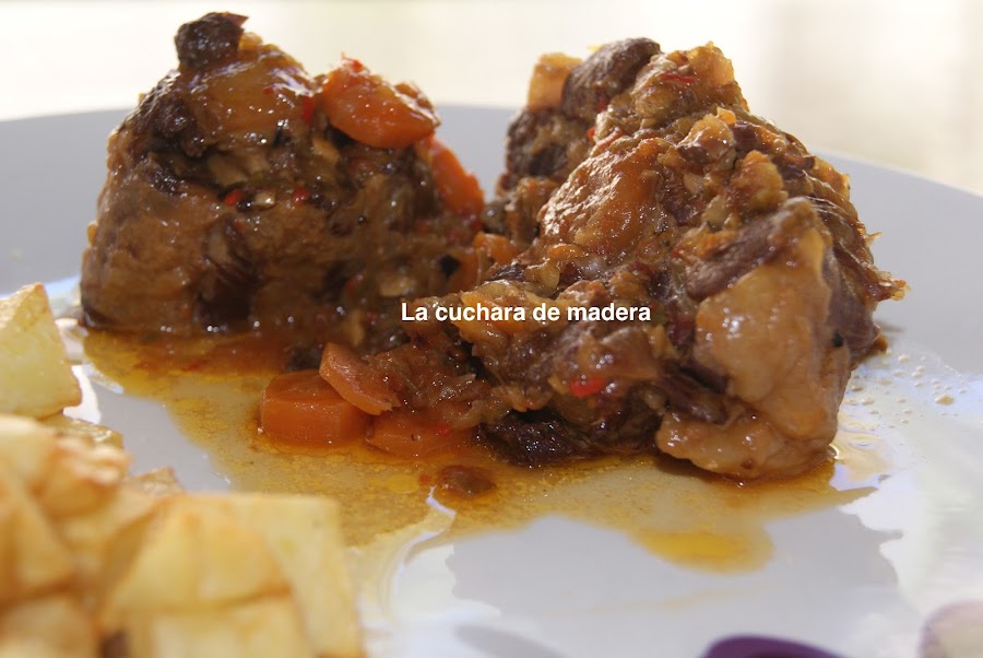 En un lado del plato ponemos las papas fritas y 2 trozos de rabo con su salsa encima