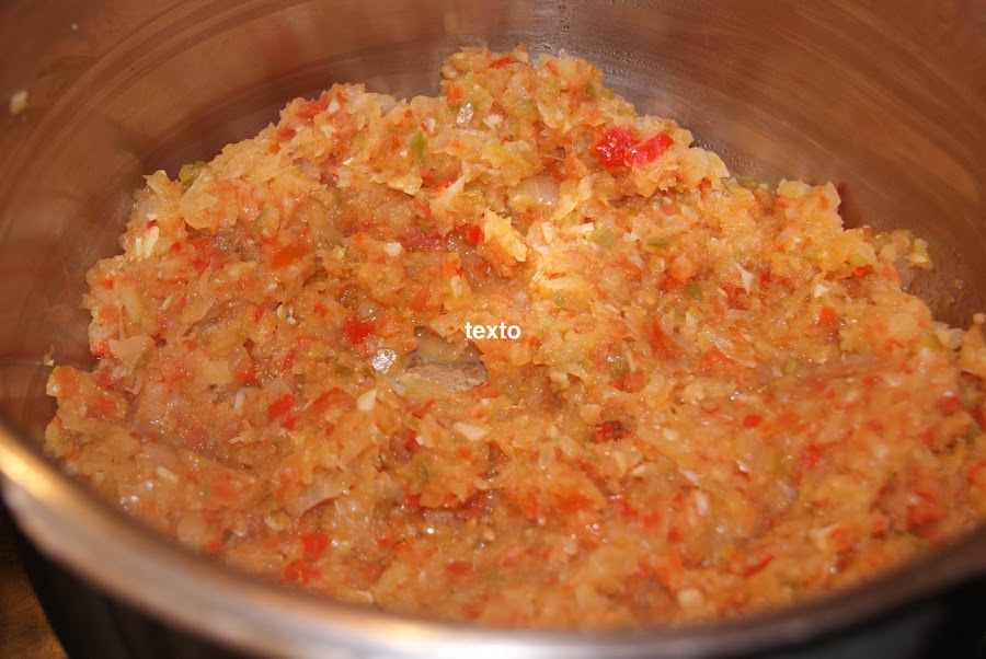 Hacemos lo mismo con los pimientos, tomates y los ajos; lo ponemos en el caldero con un poco de aceite. En este caso no voy a triturar la salsa, si desean una salsa homogénea ponen las verduras en trozos y cuando el rabo esté hecho, separan el rabo y trituran con la batidora las verduras.
