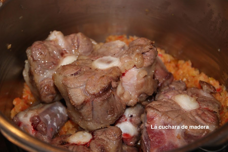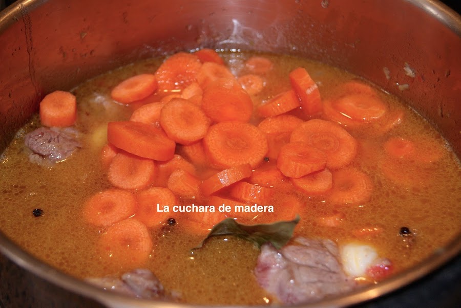 Las metemos en el caldero junto con el laurel, la pimienta y los clavos y sal; si lo haces en la olla tardará una hora, dependerá de la olla, en un caldero tarda unas dos ó dos horas y media, tienes que comprobar que la carne está tierna e ir añadiendo agua ya que se consume
