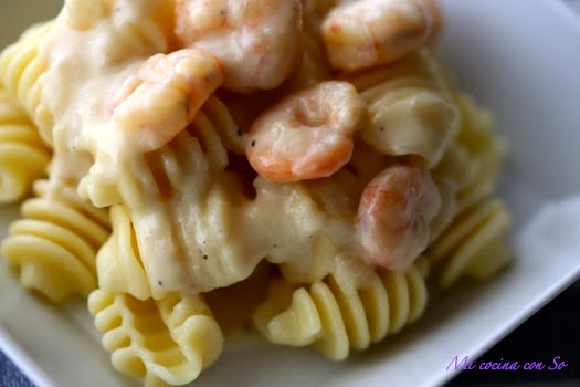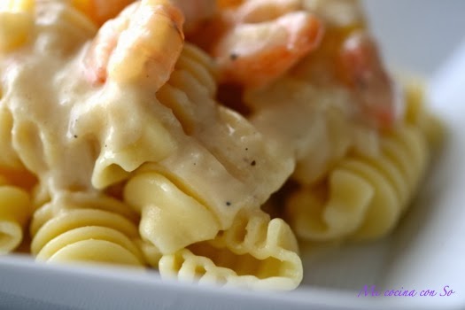 Mientras, rehogamos el ajo y la cebolla en una sartén con el aceite. Cuando la cebolla esté blanda y transparente, añadimos las gambas previamente descongeladas y salteamos a fuego fuerte. A continuación añadimos el brandy y transcurridos un par de minutos, añadimos la leche evaporada, la sal y la pimienta. Cocemos hasta que espese la salsa y servimos sobre la pasta escurrida.