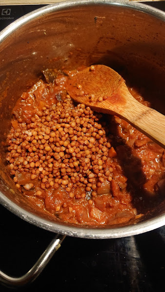 Ahora echas el tomate concentrado, remueves para integrarlo y que aromatice y luego viertes la lata de tomates enteros y el caldo de verduras. Dejas cocinar todo 15 minutos a fuego suave. Al final añades las lentejas ya cocidas y escurridas y mezclas todo con cuidado.