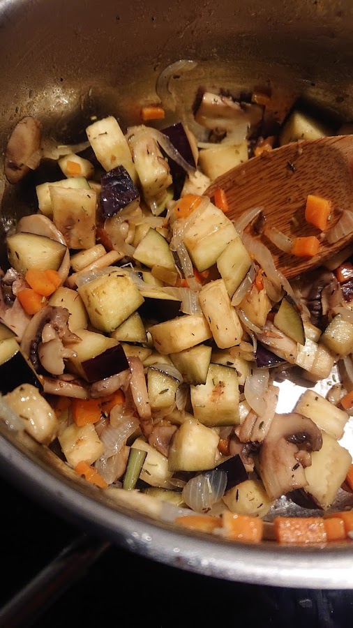 Corta los champiñones en trocitos y pica el ajo. Echas todo dentro y dejas que se cocine todo el conjunto. Buen momento para añadir pimienta negra recién molida y las especias: tomillo, romero, orégano, salvia...