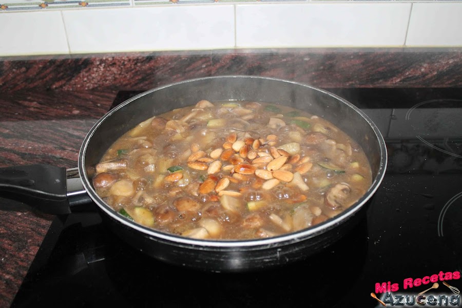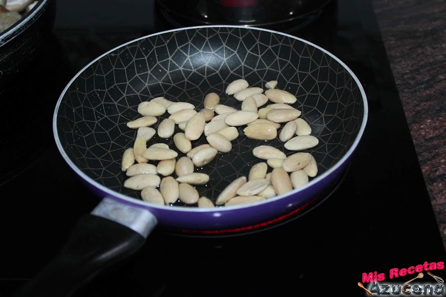 Mientras pasan los 6 minutos pondremos otra sartén al fuego, a fuego medio, cuando este caliente añadiremos un poco de aceite para freír las almendras, estas las dejaremos hasta que empiecen a tomar color, en ese momento las retiraremos y las añadiremos a la sartén de las setas.