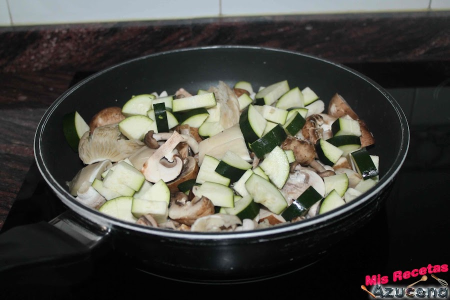 Ponemos una sartén al fuego, a fuego medio, cuando este caliente añadiremos fondo de aceite cubriendo ligeramente el fondo, añadimos las setas junto con el calabacín, salpimentamos y dejamos durante 2 minutos.