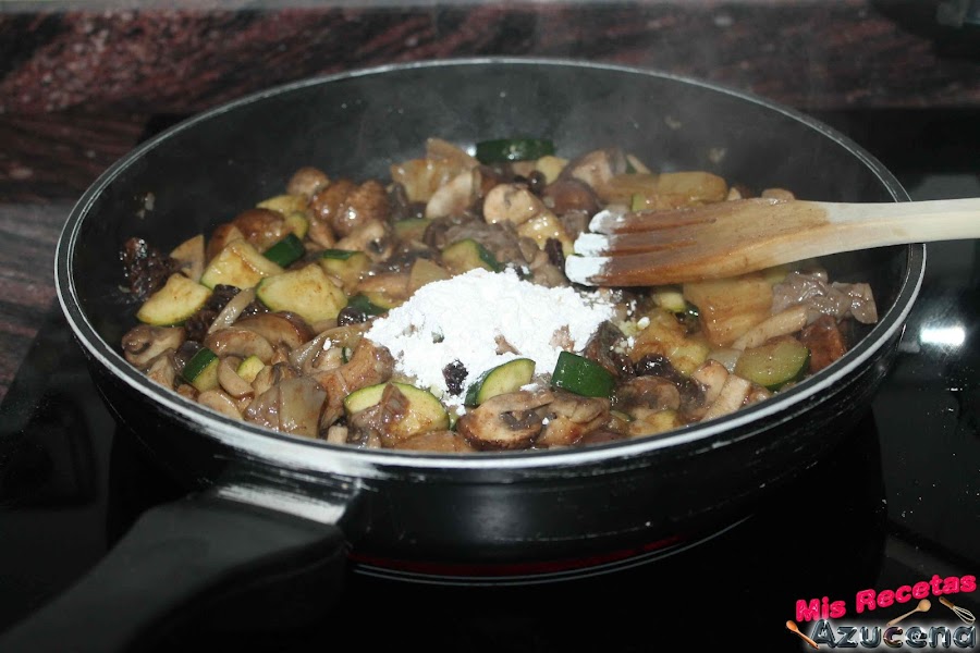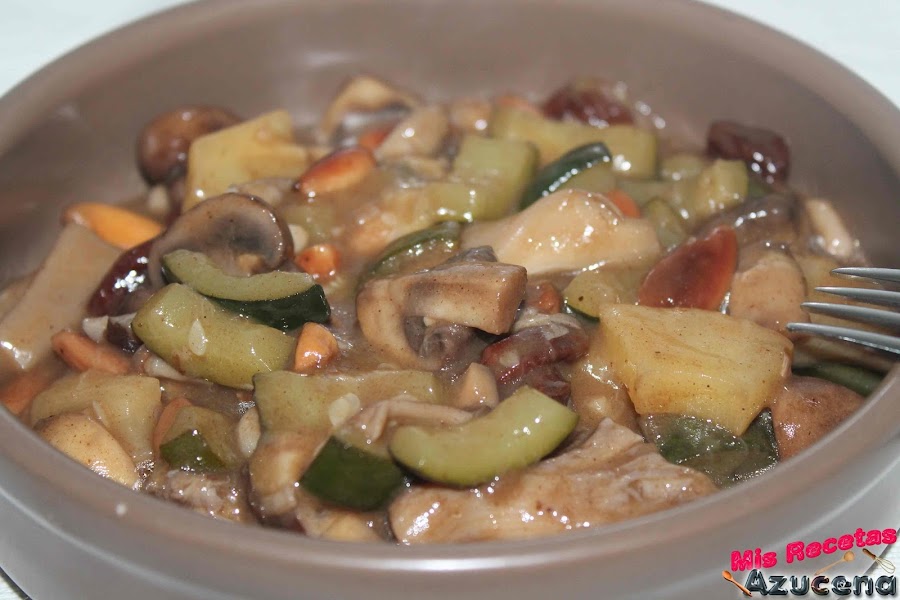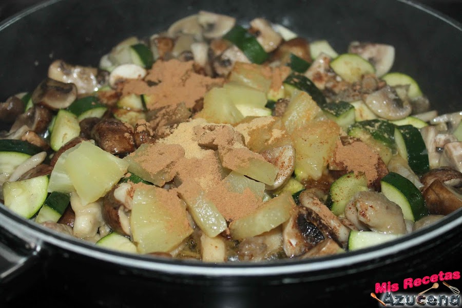 Pasados los 2 minutos añadiremos el jengibre, la canela, las pasas que las habremos escurrido bien y la piña que la tendremos picada en trozos no muy grandes, removemos todo y dejamos otros 2 minutos más para poder añadir la maicena y el caldo, volvemos a remover todo, tapamos la sartén y dejamos otros 6 minutos más.