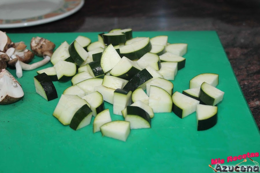 Seguimos con el calabacin que lo lavaremos bien pues lo dejaremos con la piel y lo picaremos en trozos más o menos del mismo tamaño que las setas.