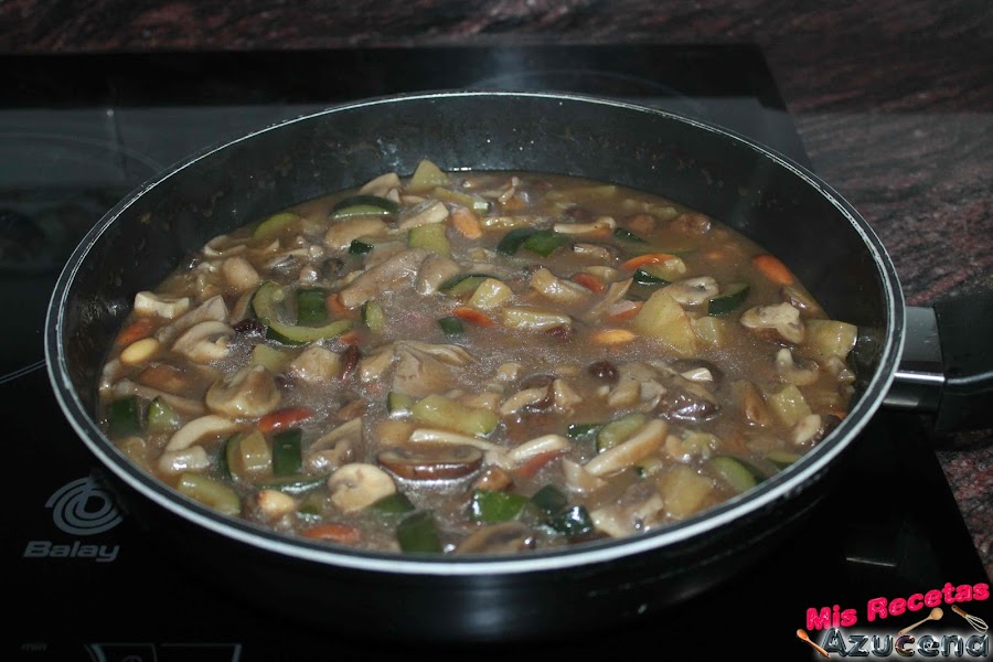 Comprobamos el punto de sal removemos todo bien, tapamos la sartén y dejamos que el caldo espese hasta formar una salsa, el tiempo que se llevara será entre 10 y 15 minutos, una vez esté a nuestro gusto retiramos del fuego y dejamos reposar un poco.