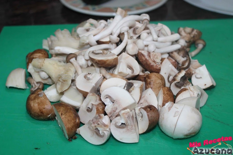 La variedad de setas que he usado son champiñón común, seta portobello, seta cardo y shimeji, estas últimas las dejaremos enteras no las picaremos.