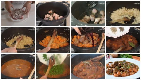 Cubrimos la carne con agua o caldo de carne y dejamos cocer; si lo hacemos en una cazuela convencional lo tendremos cociendo 1 hora aproximadamente pero si lo preferís hacer en olla rápida el tiempo se reducirá a uno 20 minutos.