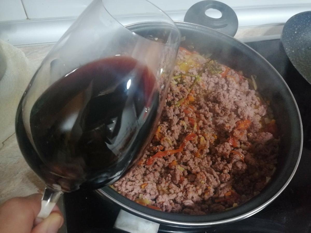 Cuando la carne esté hecha la echamos a la cazuela, removemos y dejamos que se mezcle todo. Unos minutos después añadimos una copa de vino, que se mezcle bien y después un vaso más de caldo de carne o de agua.
