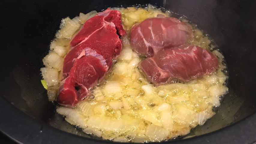 Cuando tenga color introduce la carne, salpimiéntala y dórala un poco.