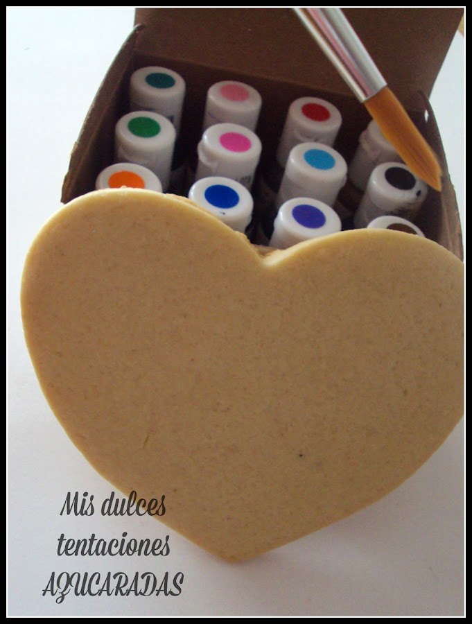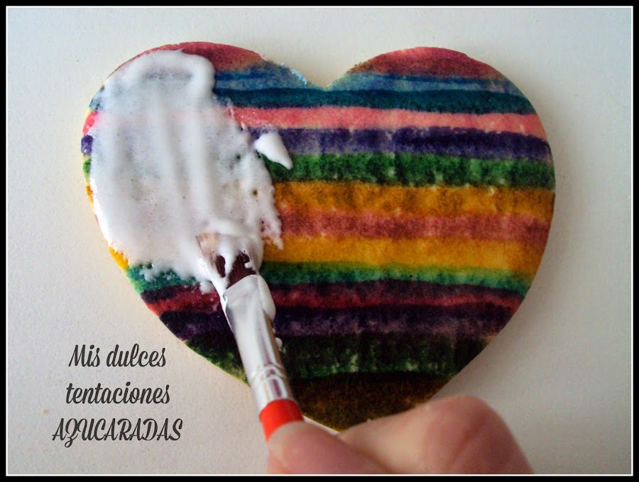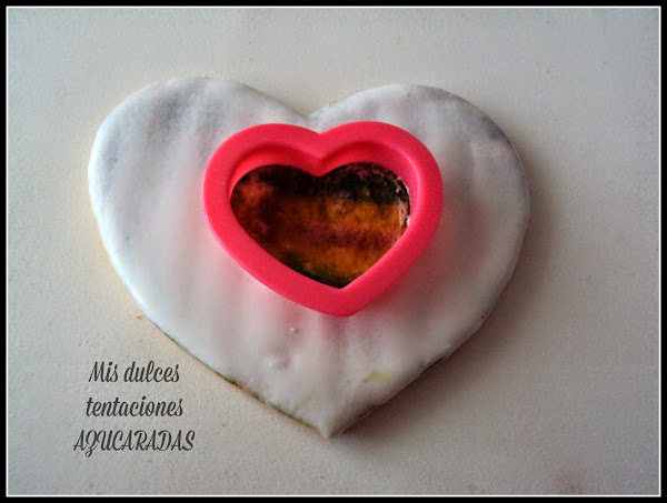 Ahora lo ideal sería dejar secar la glasa de un día para otro,pero en el caso del corazón central de esta galleta el trabajo de raspado se haría interminable,así que después de dejar pasar una media hora para no estropear el resto de la galleta,cogemos un cortador más pequeño y lo colocamos en el centro y ayudándonos de un trozo de papel de cocina o similar limpiamos la glasa que queda en el interior del cortador de forma que los colores que habíamos pintado inicialmente quedarán al descubierto.