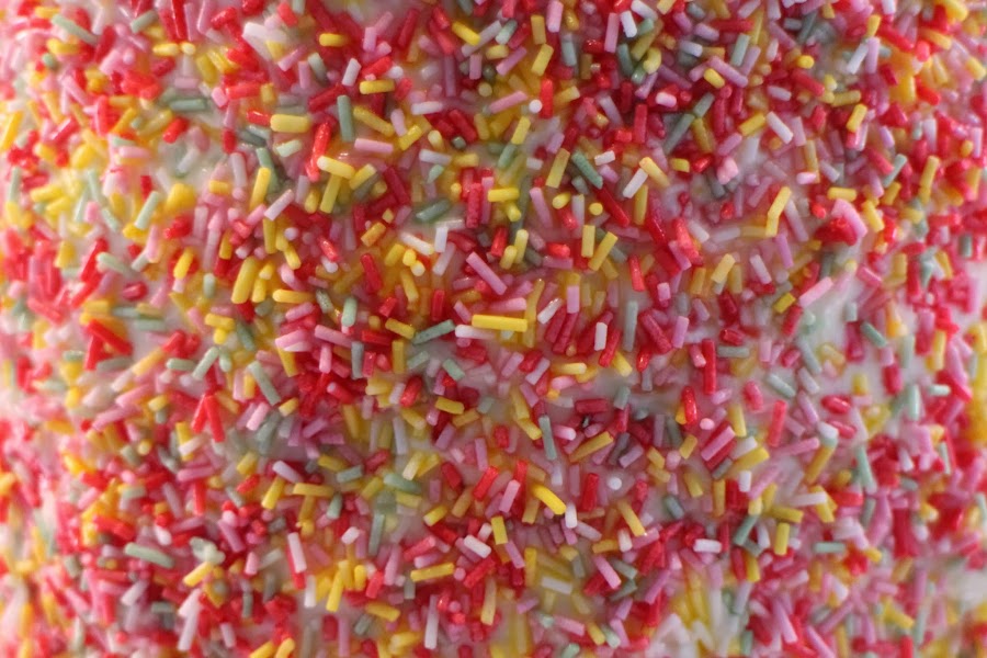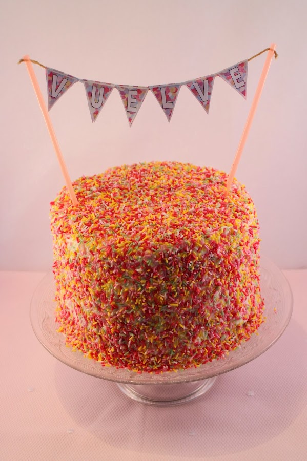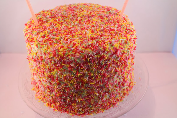 Y ahora viene la parte divertida: cubrir toda la tarta con sprinkles, en este caso fideos de colores.