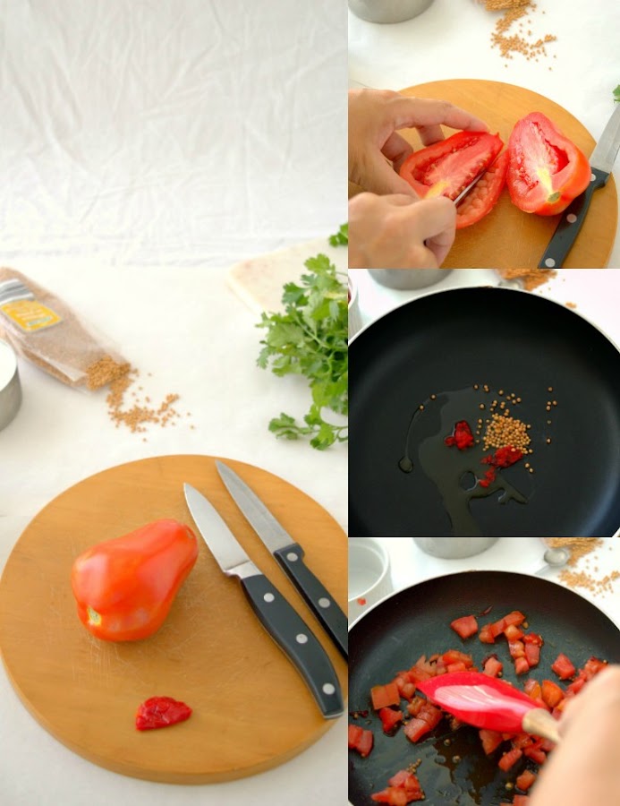 Wash and dry the tomato. Take out the green part of the tomato and cut into small dice.