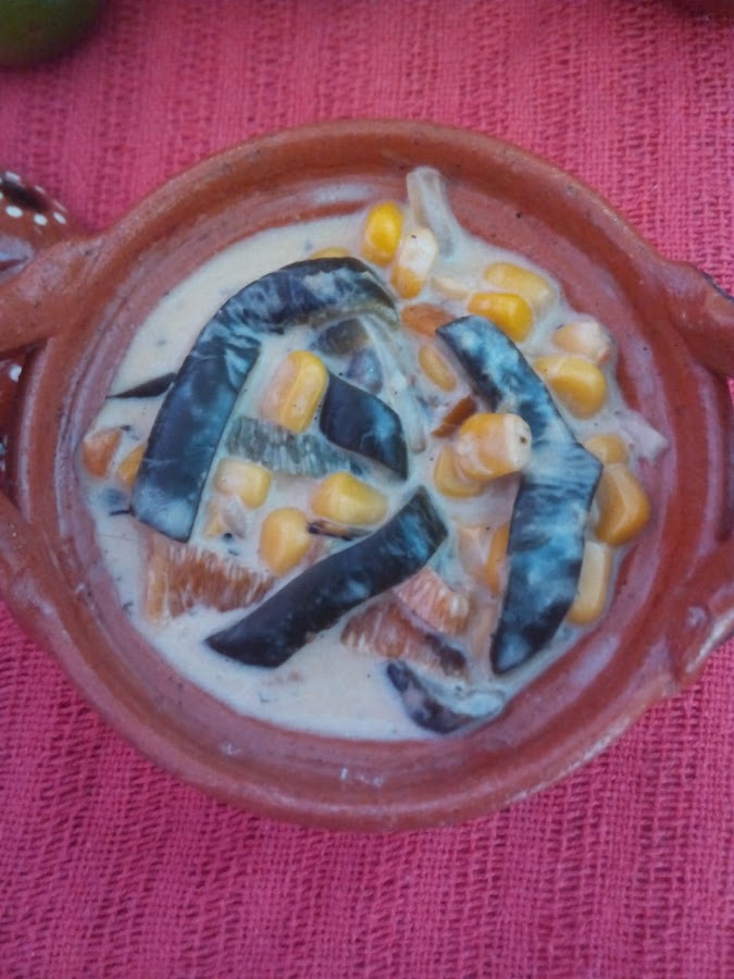 1. Asa los chiles poblanos en un comal o directamente sobre la flama, volteándolos de vez en cuando, hasta que su piel se haya quemado uniformemente. Deja que suden dentro de una bolsa de plástico durante 5 minutos, luego pélalos, desvénalos y córtalos en rajas.