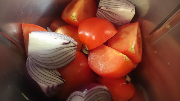 Con ayuda de la Thermomix o de una trituradora, picamos los tomates, la cebolla, el ajo y el jengibre hasta obtener una consistencia homogénea. Salpimentamos al gusto, es decir, al tuyo.