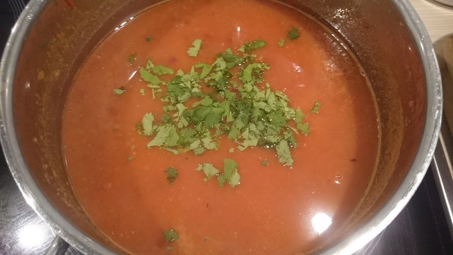 Vamos preparando todos nuestros ingredientes ("mise en place") para trabajar con mayor comodidad. Lavamos los tomates, pelamos el ajo, el jengibre (siempre con ayuda de una cucharilla de café, para limpiar bien la corteza sin llevarnos mucha carne por delante) y la cebolla morada en trozos grandes, picamos el cilantro y disponemos por separado las especias.