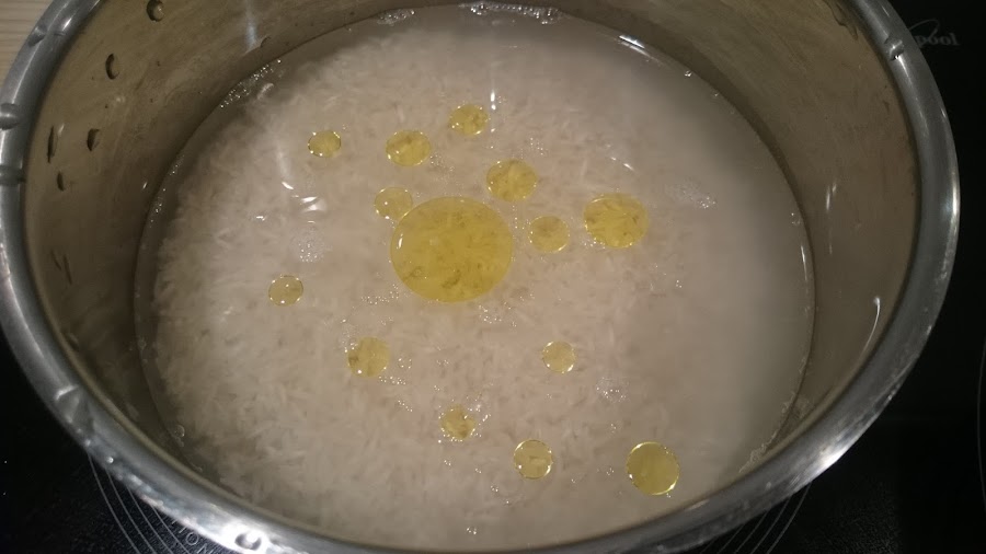Lo ponemos en una olla y cubrimos de agua. Añadimos un chorrito de aceite - o una nuez de mantequilla - y llevamos a ebullición a fuego vivo.