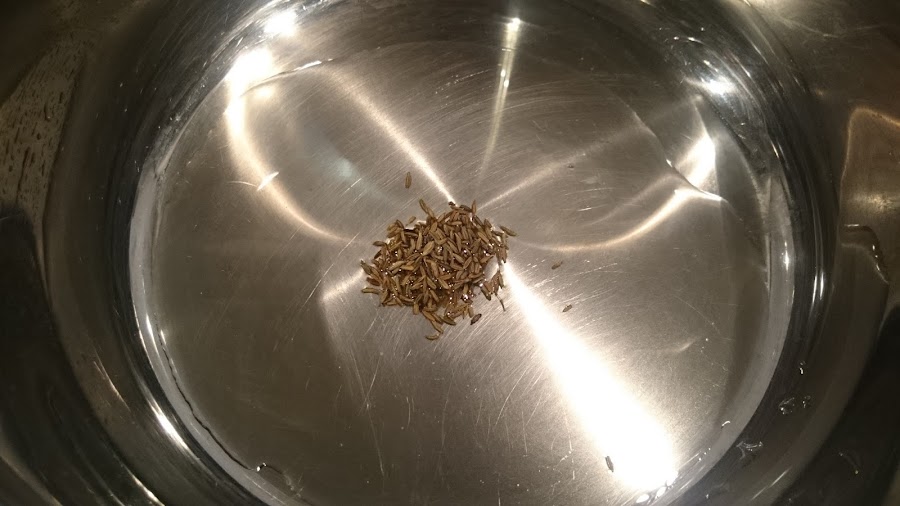 En una olla amplia echamos 1 cucharada de aceite de girasol y vertemos las semillas de comino. Las cocinamos hasta que "exploten" y saquen toda su fragancia. Incorporamos la pasta de tomate y removemos bien unos minutos para que vaya espesando la salsa.