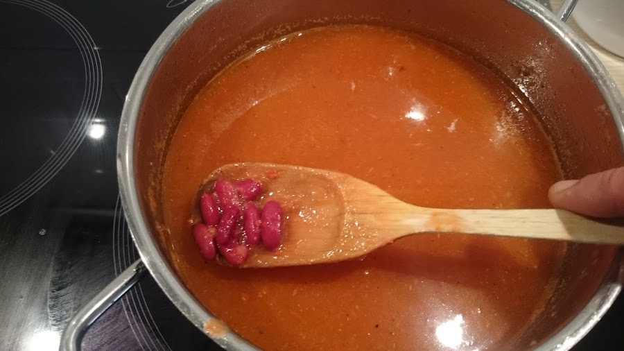 Añadimos las judías cocidas, las especias (cúrcuma y Garam Masala), el agua (750 grs) y probamos el punto de sal. NOTA: Siempre es importante ir catando nuestros platos para corregir antes de que sea demasiado tarde y echemos a perder la creación.